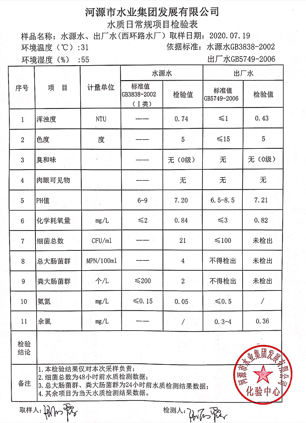 2020年7月19日水質(zhì)檢驗(yàn)報告
