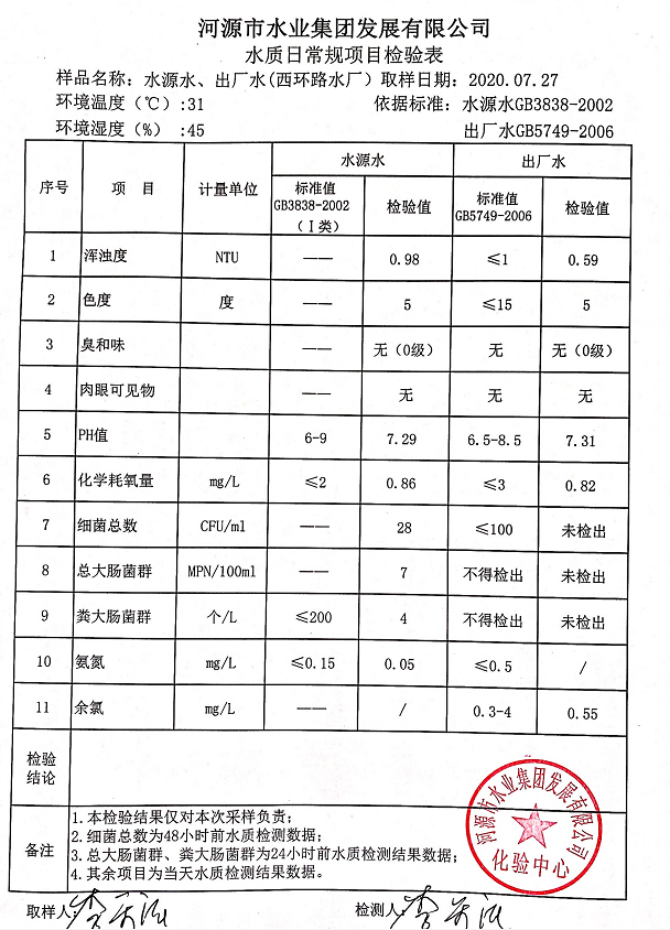 2020年7月27日水質(zhì)檢驗報告