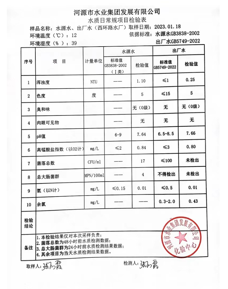 2023年1月18日水質(zhì)檢驗(yàn)報(bào)告