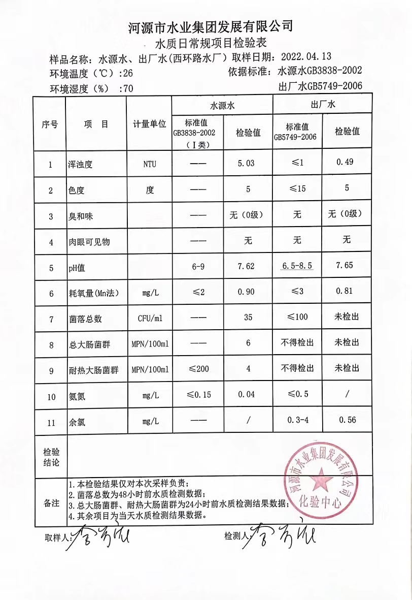 2022年4月13日水質(zhì)檢驗(yàn)報告